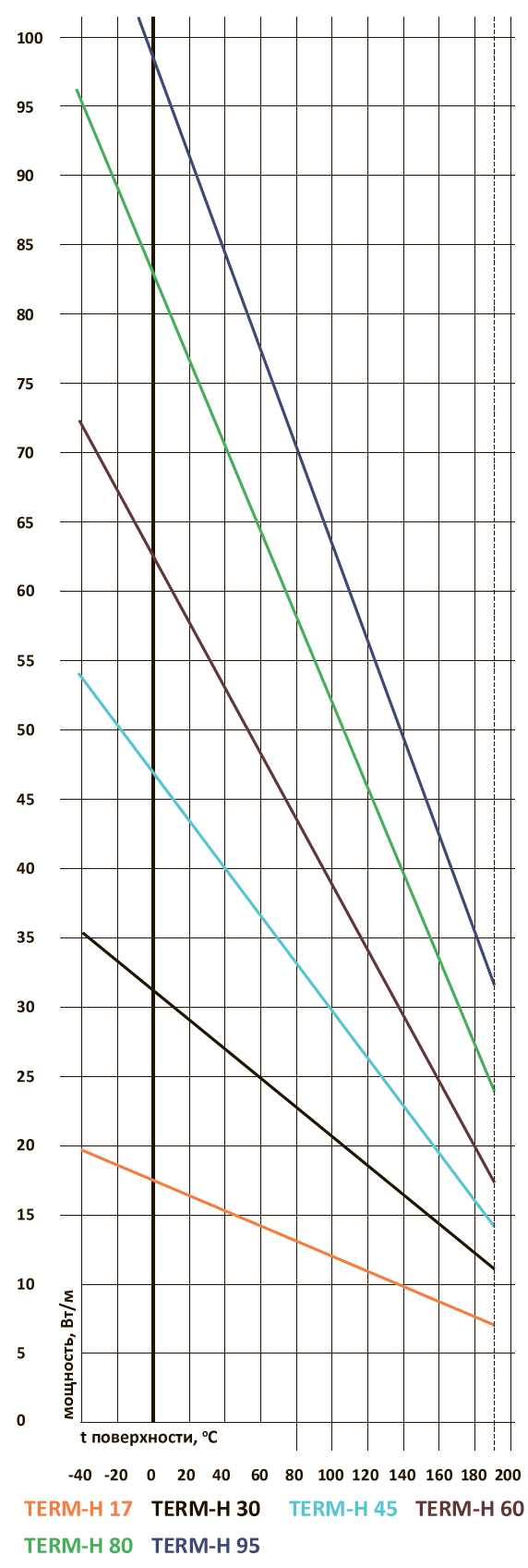 | Мощность тепловыделения | 17, 30, 45, 60,80, 95 Вт/м |