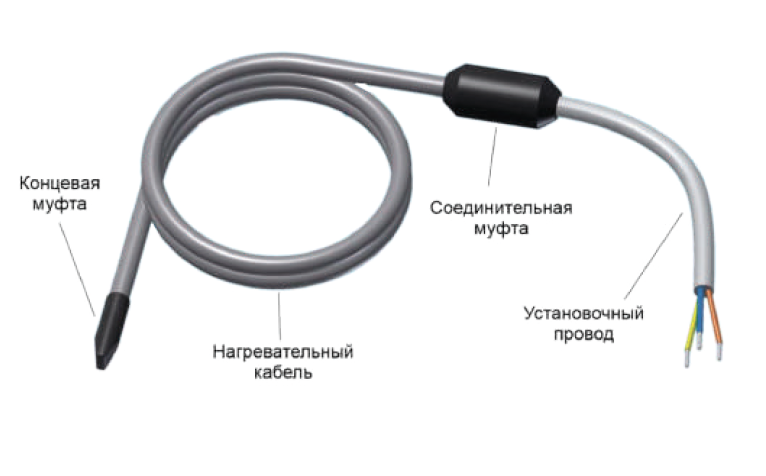Нагревательная секция TERM 17R состоит из тепловыделяющего элемента на основе двухжильного резистивного кабеля (нагревательного кабеля), оснащенного с одной стороны соединительной муфтой и установочным проводом, а с другой — концевой муфтой. Цвет изоляции жил установочного провода: жёлто-зелёный – экран, синий и коричневый – нагревательная (токопроводящая) жила.