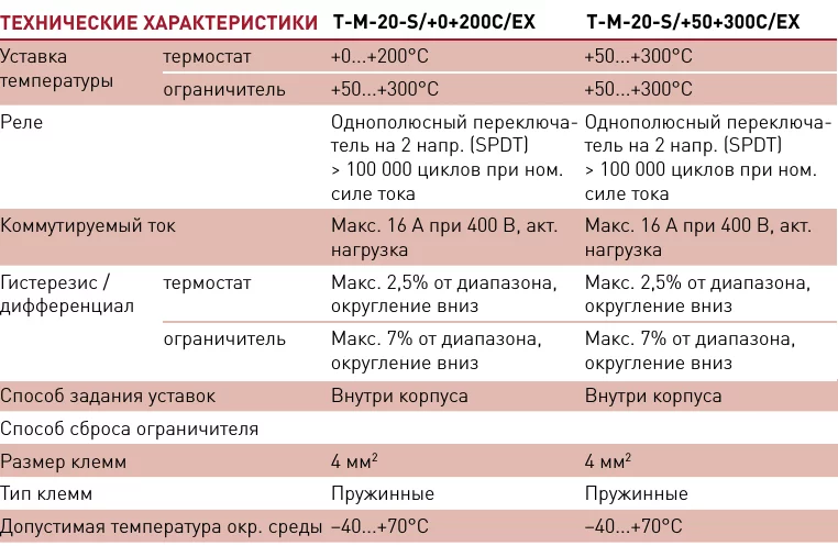 Термостат с регулированием по температуре обогреваемой поверхности обеспечивает управление температурой и ее ограничение в безопасном диапазоне во взрывоопасных зонах. Ограничитель предотвращает перегрев системы обогрева свыше установленной температуры в случае отказа системы управления или достижения процессом небезопасной температуры. Термостат рассчитан на макс. номинальное напряжение в 400 В и макс. коммутируемый ток в 16 A, что достигается за счет использования независимых EEx d однополюсных перекидных микропереключателей с «сухими» контактами.